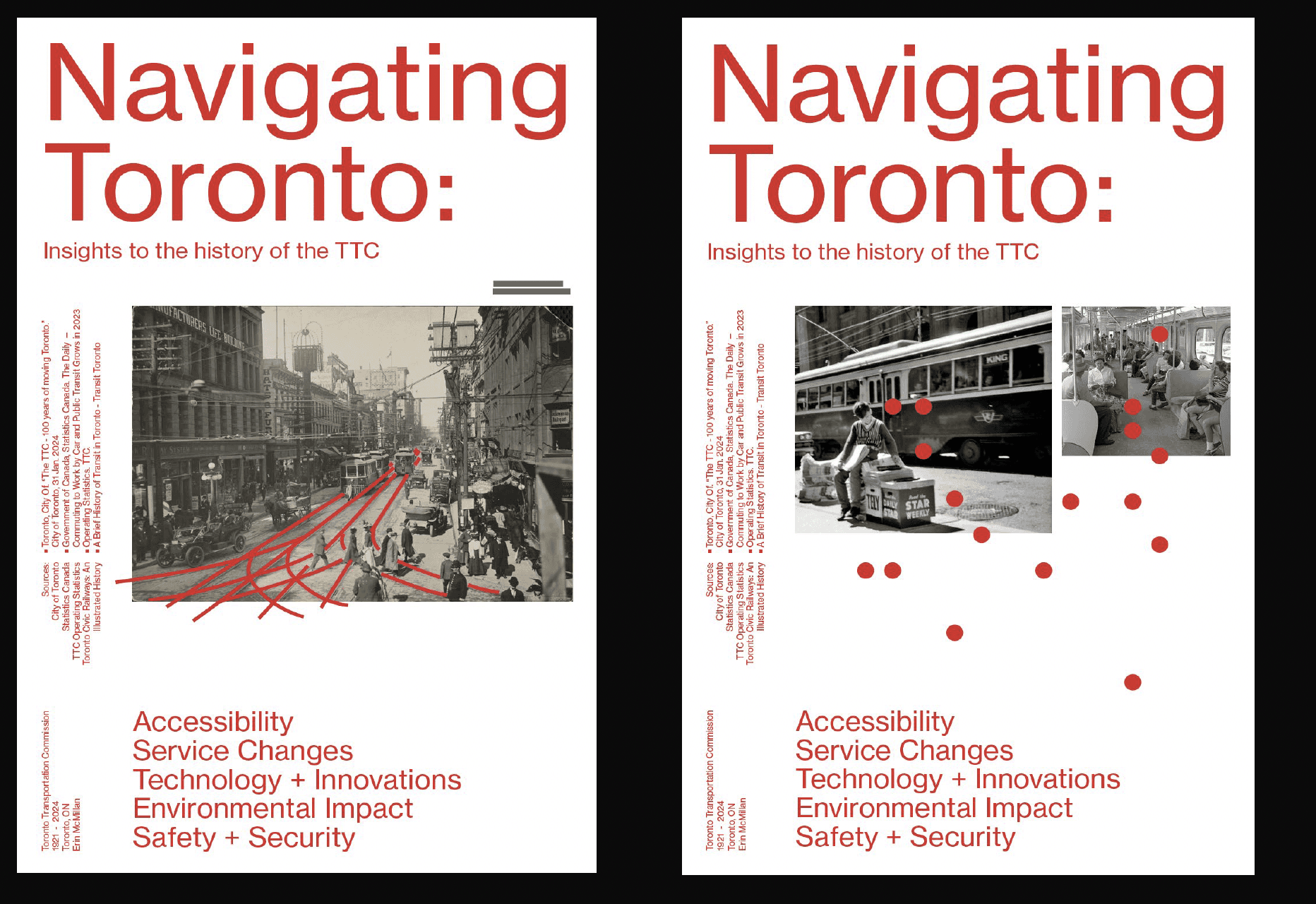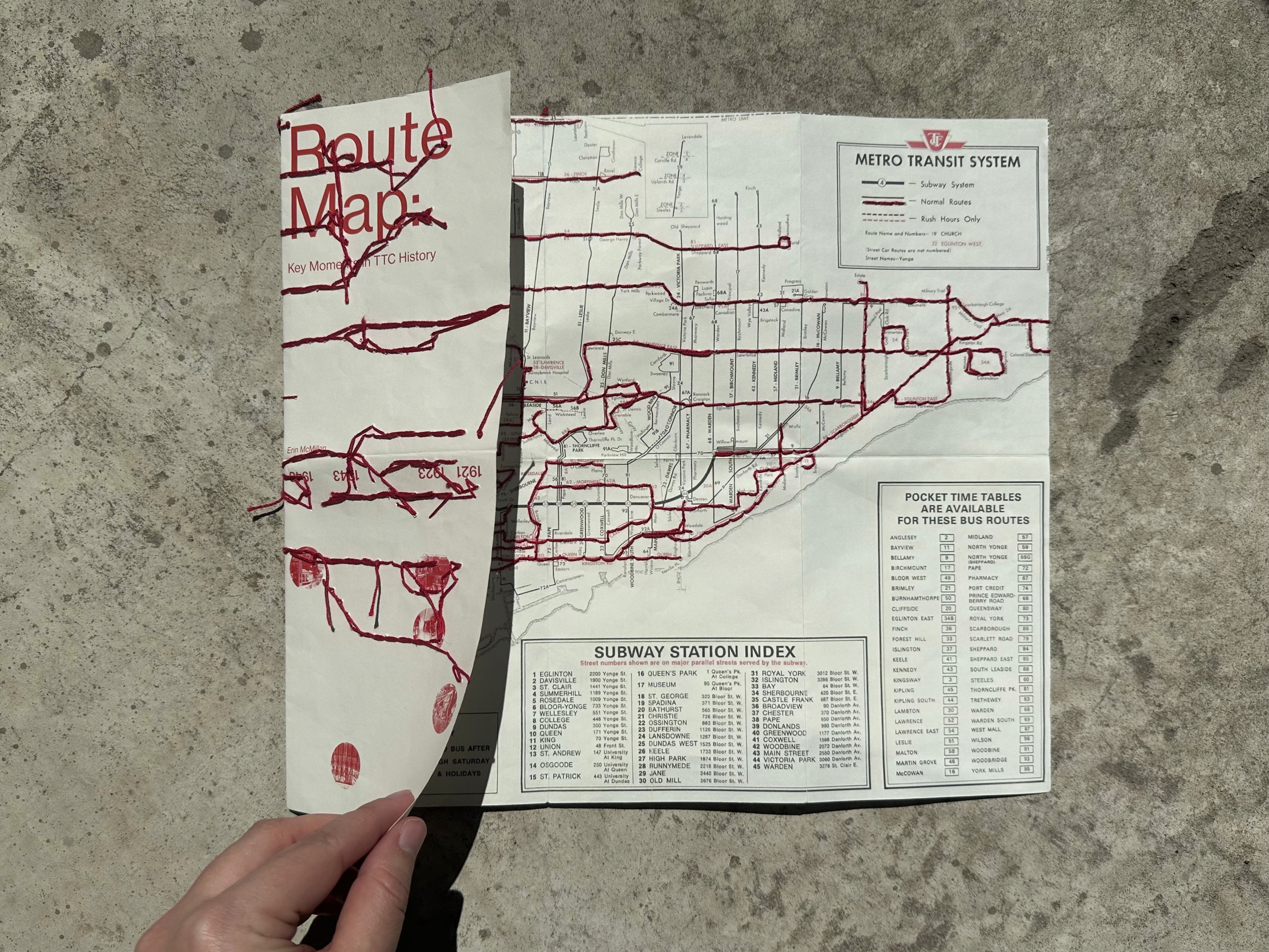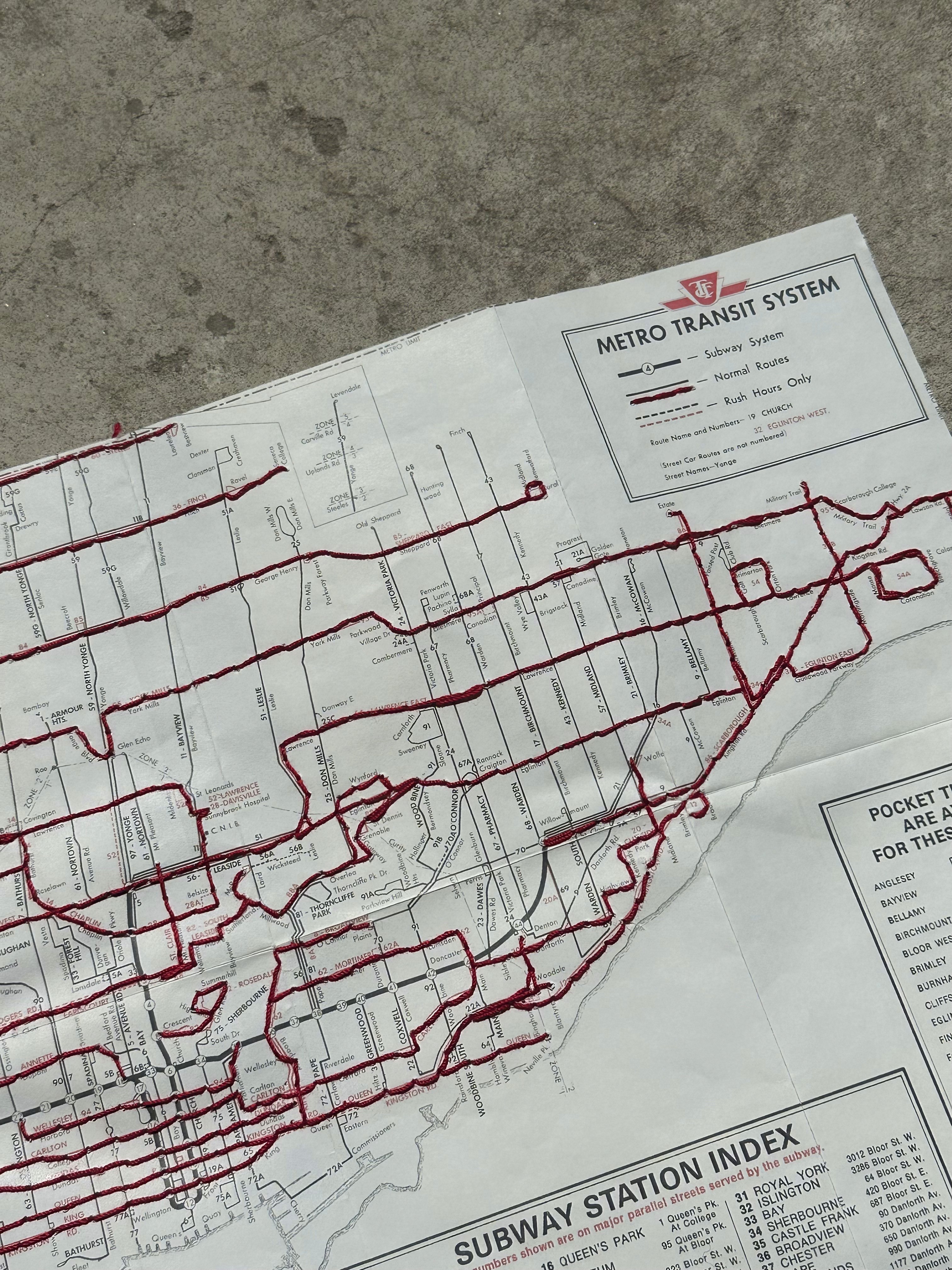 This project focused on data visualization, where I researched and collected data from the Toronto Transit Commission (TTC). The project resulted in three outputs: an initial poster design outlining my concept, a publication, and a sensory component. I developed a strong visual identity that felt connected to the existing TTC branding while introducing a more modern and considered approach. The sensory component—a tactile map—was created by stitching thread onto a printed transit map, adding a tangible, interactive layer to the data.